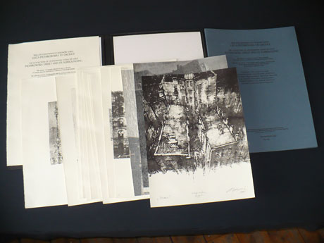 Teka litografowanych widoków Łodzi, 18 litografii na papierze 53 x 39,5 wykonanych przez studentów IV semestru Instytutu Architektury i Urbanistyki Politechniki Łódzkiej oraz Jacka A. Jaroszewskiego i Witolda Warzywodę. 2002, oprawa: tektura, płótno introligatorskie, obwoluta litografowana, format: 55,5 x 41 x 2, 2002 |